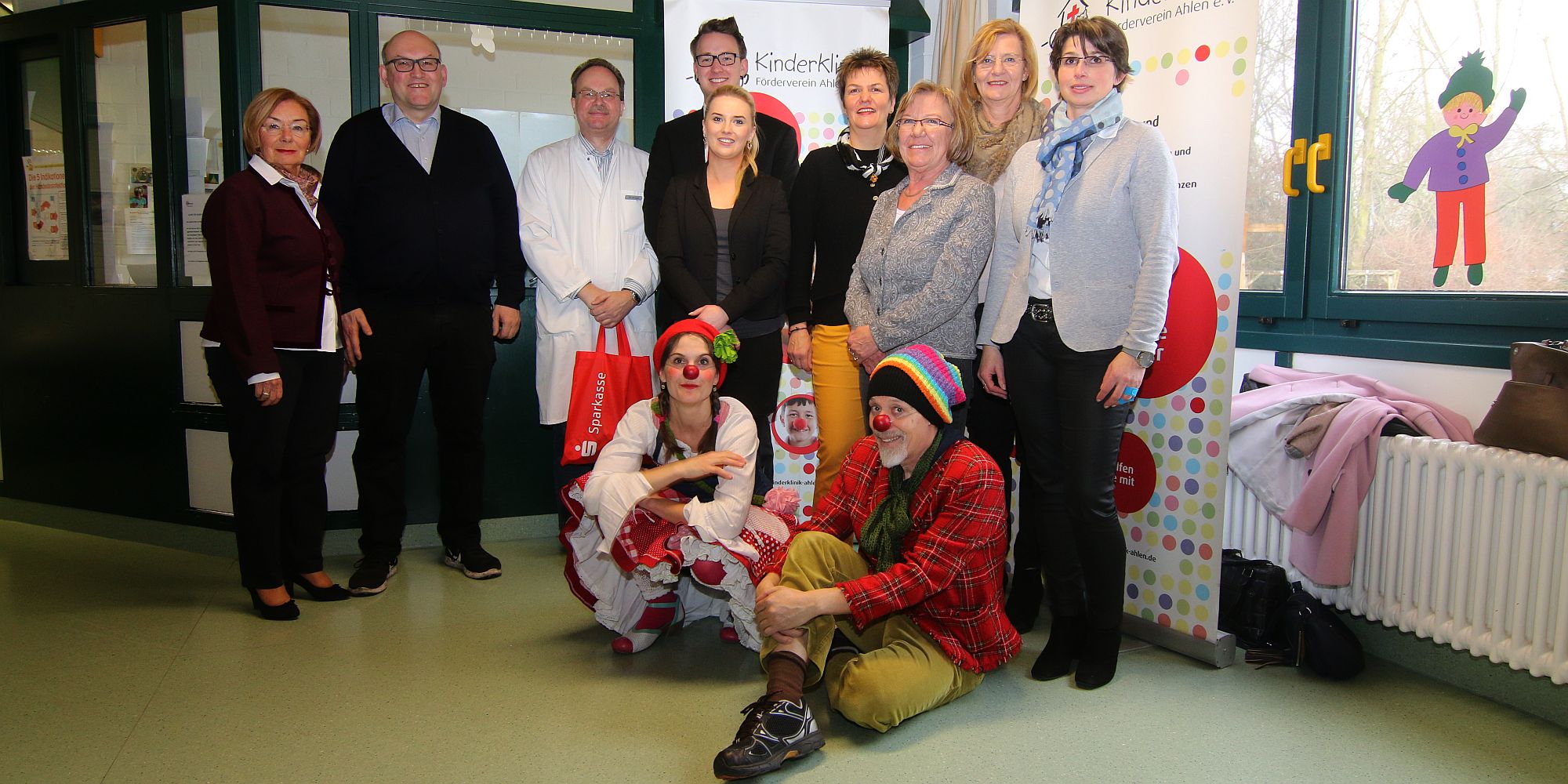 „Ahlen war wieder dran“, begründete Vivien Raring die Wahl des Fördervereins für die Spende und brachte zusätzlich einige „Pixi-Bücher“ für die jungen Patienten mit. Begeistert war sie genauso wie Johannes Kroos und Astrid Eckel von der Ahlener Sparkassen-Hauptstelle von den Klinikclowns „Lisette“ und „Mozzarella“, die bei der Übergabe anwesend waren und mit den Spendern so ihren Schabernack trieben.