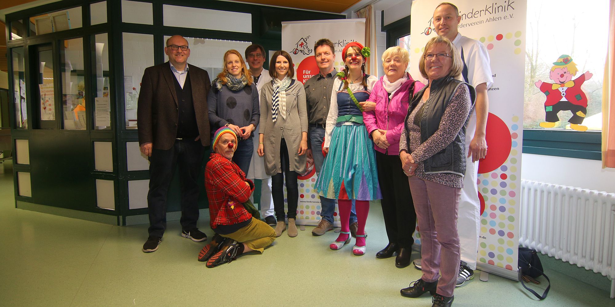 Foto: Eine Tombola für eine gute Sache: Mario Wesselmann, Iris Elkmann, Klinikclown Danilo Bürki, Oberarzt Dr. Sven Wild, Kristin Sehlleier, Horst Neitemeier, Klinikclown Elisabeth Bohren-Harjes, Waltraud Hunke, Stationsleiter Andreas Sentker und Ruth Kuretitsch (v.l.)