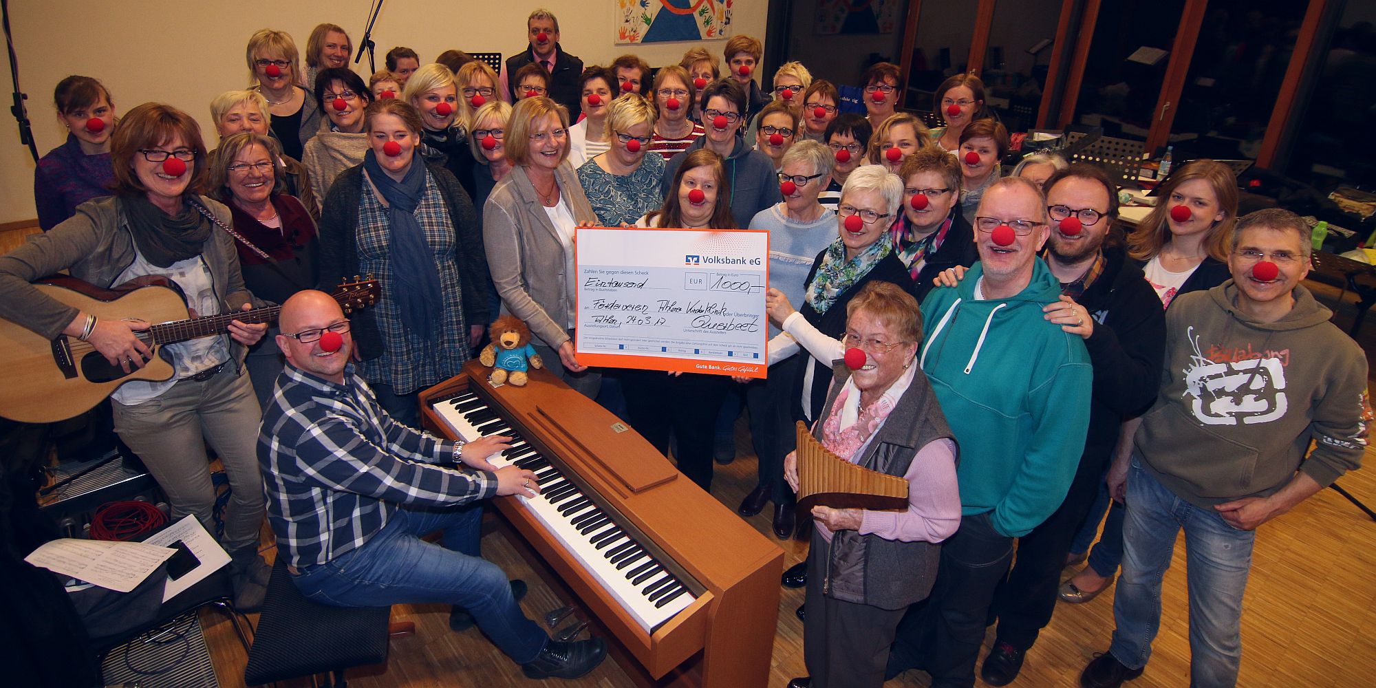 Am Donnerstagabend besuchten die Stellvertretende Vorsitzende Rita Pöppinghaus-Voss und ihre Vorstandskolleginnen Waltraud Hunke und Ruth Kuretitsch den Chor bei seiner wöchentlichen Probe im Pfarrheim St. Lambertus, um sich für die Spende zu bedanken. Für große Freude sorgten sie bei dem Chor, als sie jedem Sänger eine knallrote Clownsnase schenkten, die mittlerweile das Markenzeichen des Fördervereins geworden ist.