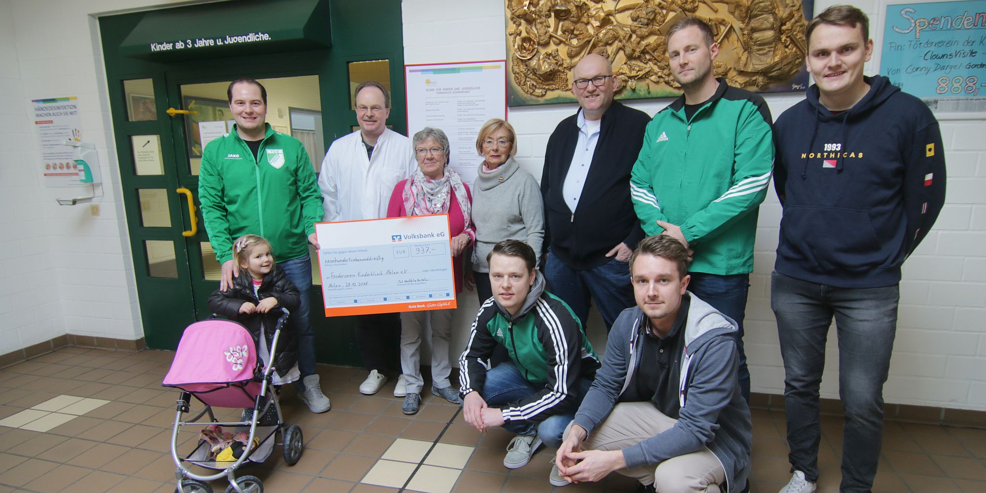 Foto: Spende für die Klinikclowns: Charlotte und Manuel Wiesrecker, Chefarzt Dr. Carsten Krüger, Ruth Kuretitsch, Angelika Masjosthusmann, Mario Wesselmann, Thorsten Böckamp und Julian Eilert (stehend v. l.) sowie Simon Büscher und Julian Halbe (knieend v. l.).